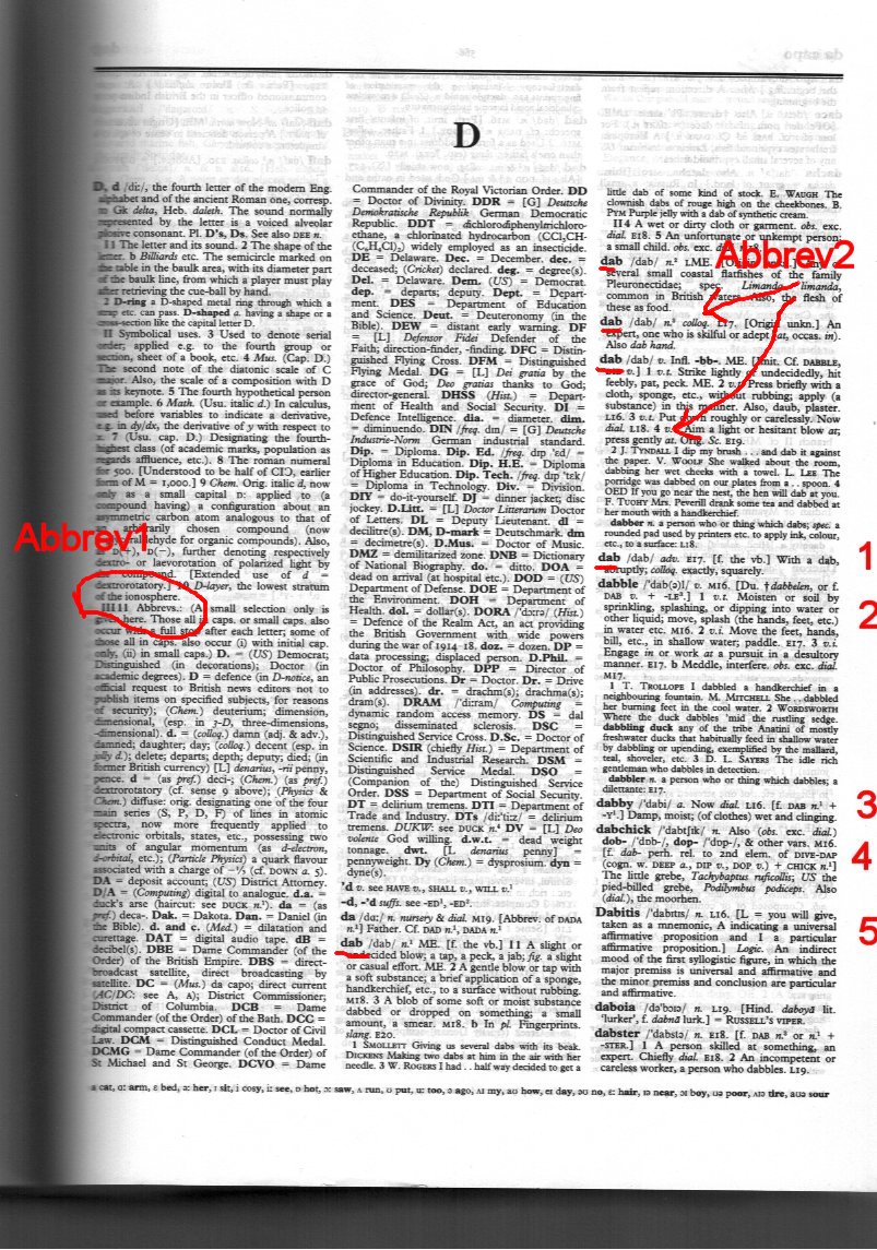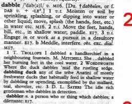 So this is slightly ambiguous, because he says that words that are spelled like words already in OED 1 are skipped, because he's interested in new forms, not new meanings to old forms, so does that mean he would only count the one "dab" (we see multiple dabs in the picture you give), or that, provided that all those dabs were not in the OED 1 he would count all of them. I have to assume its the former since the latter doesn't make sense.