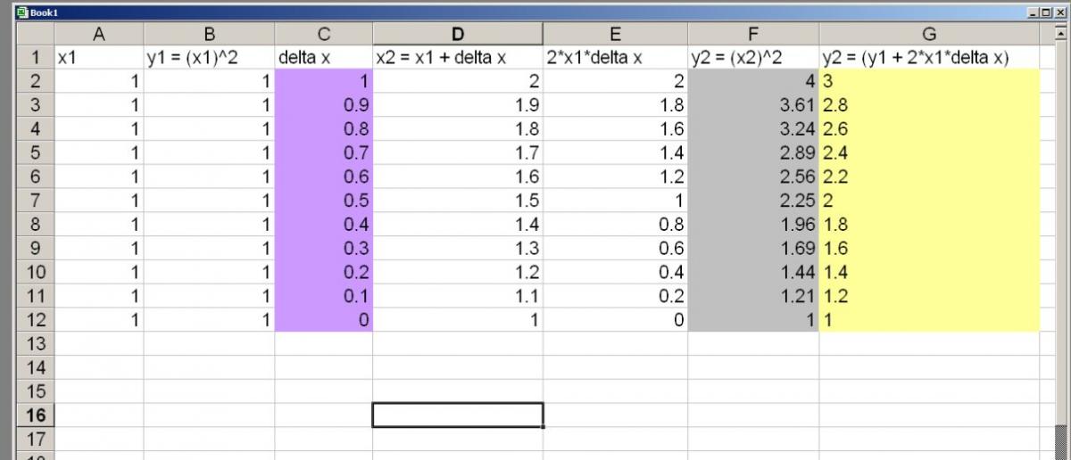 As delta x gets smaller (the purple column) the value of y calculated from the approximate formula (the yellow column) gets closer and closer to the true value (the grey (column) calculated from the 'primitive'.