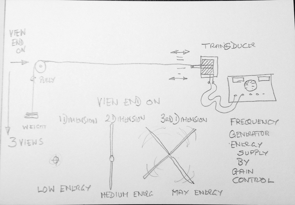 The thrust and tension is alternated from say 10 hz to several kilohertz say 25 kHz . Initially at a very low amplitude. Over this initial test the wire can be seen to absorb the back and forward thrust and pull . It can be seen there is some form of resonance of the system , when certain frequencies are passed through . But at this stage only the back and forward thrust of the wire is noticed.see LOW ENERGY .